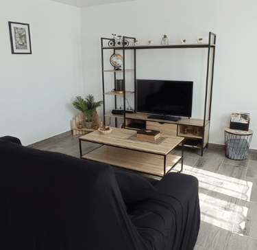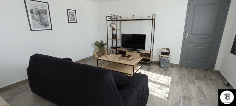 Prenez le temps de vous détendre dans un salon chaleureux, baigné de lumière naturelle. L’espace est équipé d’un canapé confortable, d’une télévision à écran plat et d’une jolie décoration aux touches vintage.