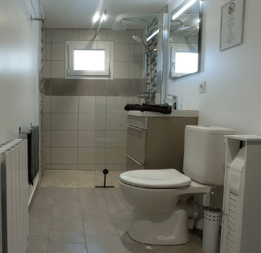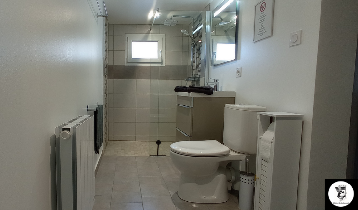 Salle d’eau spacieuse avec grande douche à l’italienne, meuble vasque et WC. L’espace est propre, moderne et pratique.