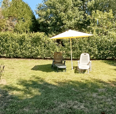 Un espace arboré et verdoyant avec transats pour se détendre, lire ou profiter du soleil.