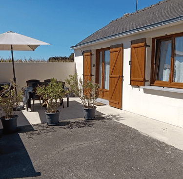 Terrasse équipée d’un salon de jardin et d’un parasol, d'un barbecue. Parfaite pour les repas en plein air ou un moment au calme.