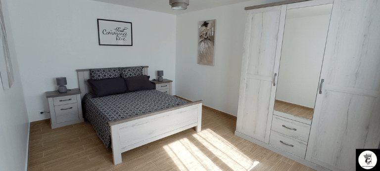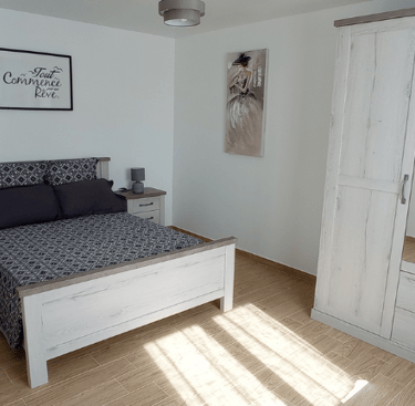 Avec son lit double, ses tons apaisants et son mobilier en bois clair, cette chambre vous promet des nuits reposantes. Une grande armoire avec penderie est à votre disposition.