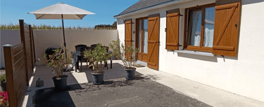 Terrasse équipée d’un salon de jardin et d’un parasol, d'un barbecue. Parfaite pour les repas en plein air ou un moment au calme.
